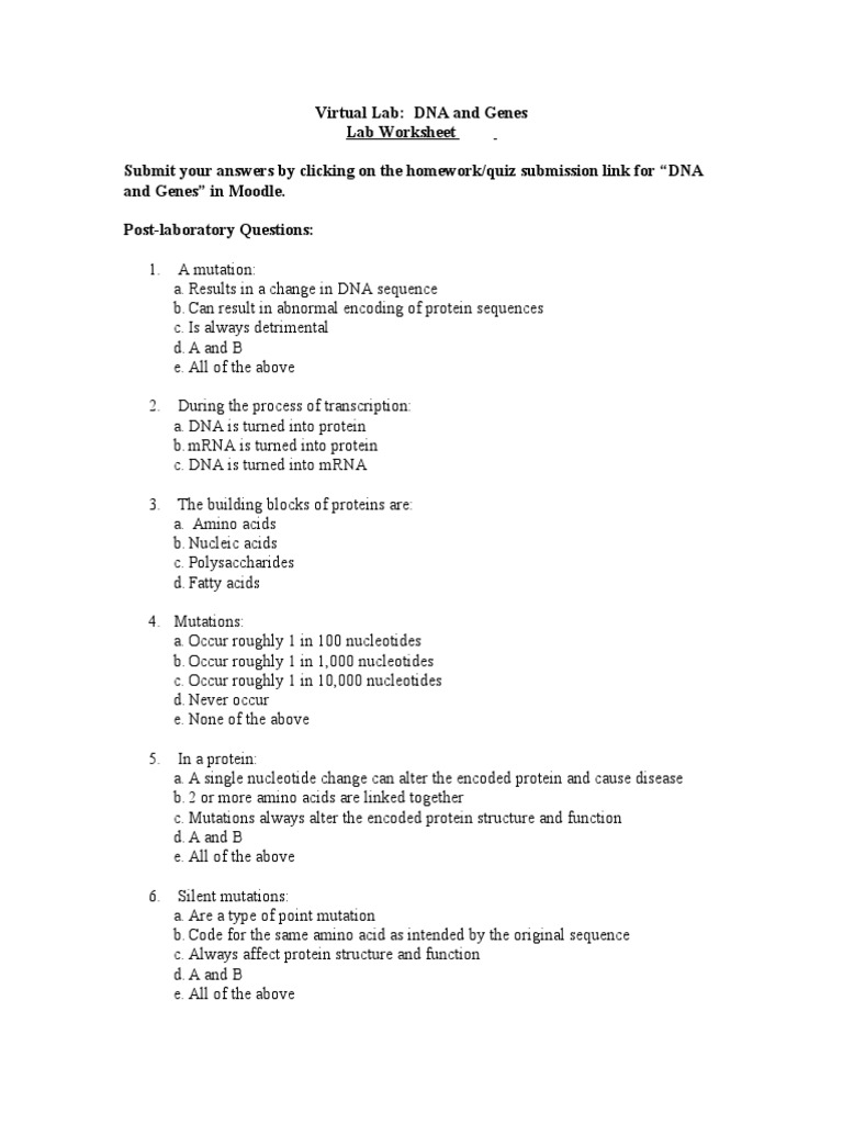 Perform this activity and witness the change a single gene mutation in the dna can have on a resulting protein. In both scenarios, it is worth defining what the labs are meant to achieve before selecting an online alternative. The user can select the uv irradiation time and then plate the bacterial suspension on a control plate and a plate that includes an antibiotic in the growth medium. These procedures often involve a number of dilutions in order to calculate data such as viable cell counts and killing curves. If you come upon terms that are unfamiliar to you, please refer to your textbook for further explanation or search the word here: This video case study explores the approaches scientists used to identify a mutation that causes retinitis pigmentosa (rp), a progressive disease that leads to blindness. In!ol!es the addition or deletion of one or more nucleotides b. This resource outlines three possible scenarios based on the focus of the labs. Once the virtual lab exercise page is visible, you are ready to begin. The antibiotic plate will produce data indicative of the amount of bacteria that have mutations resulting in resistance to the antibiotic. 22 awesome virtual lab dna and genes worksheet answers documents from dna mutations practice worksheet answer key , source:bradleymobilemedia.com the most important thing for the doctor or clinic testing a sample of saliva is to collect a saliva sample on the same day that the patient is suspected to have had the disease. Virtual lab dna and genes worksheet answers, mutations worksheet answer key and chapter 11 dna and genes worksheet answers are three main things we want to present to you based on the gallery title. Virtual lab dna and genes worksheet.